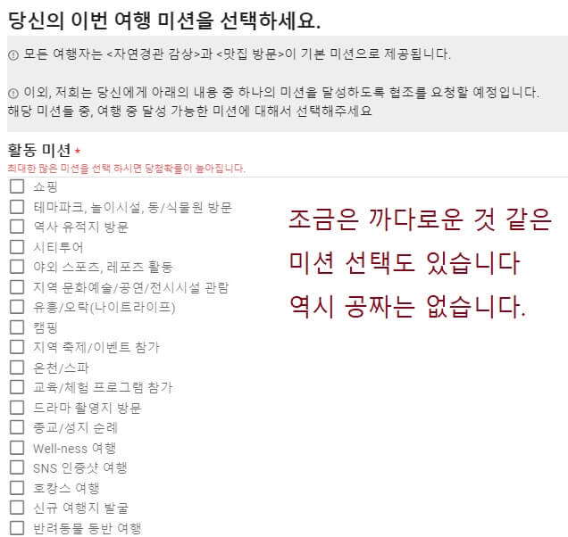 여행 미션도 물어봅니다. 하지만 어렵지 않으니 선택하시면 됩니다. 단 여행지를 선택하실 때는 경쟁이 심한 여행지는 피해 주세요. 그리고 자신이 살고 있는 시/도가 이 닌 곳을 신청하시면 좋습니다.